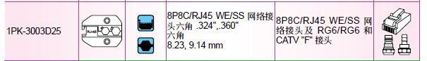 壓接/剪切/剝線能力與應用: 口模類型:網路/電話接頭 口模符號: 8P(RJ45)網路接頭, 六角形同軸接頭&中心針&光纖接頭 口模 印/刻字:無 壓接接頭(網路/電話):8P8C/RJ45 WE/SS 網路接頭, CATV F接頭 壓接線(網路/電話):RG6, RG6 4層, 網路8芯圓線, 網路8芯扁平線